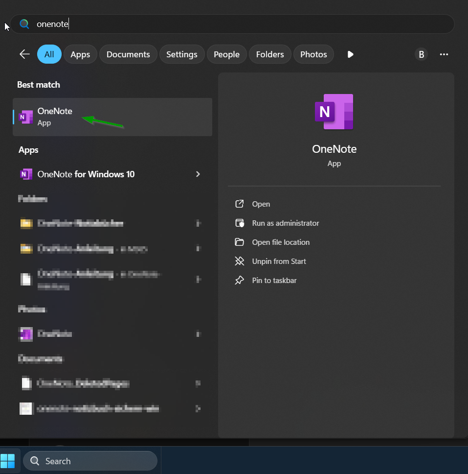 - Suchen Sie Ihr Notizbuch. Entweder im Schnellzugriff oder Sie nutzen OneDrive. OneDrive erreichen Sie z.B. über den Pfeil unten rechts / “Alle Dateien durchsuchen”.
